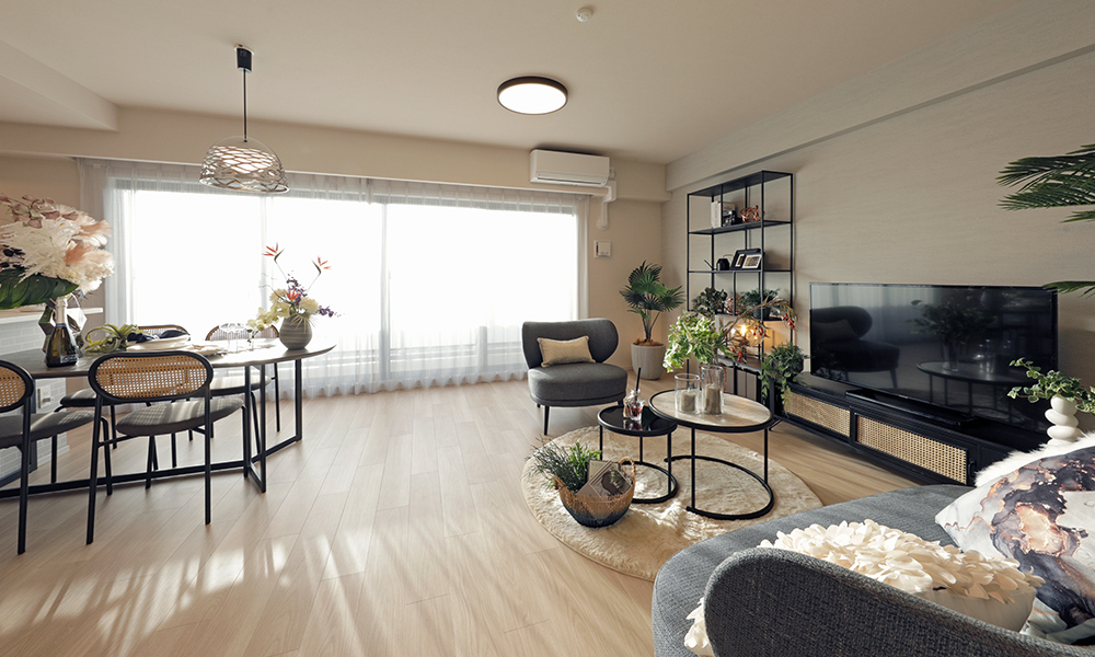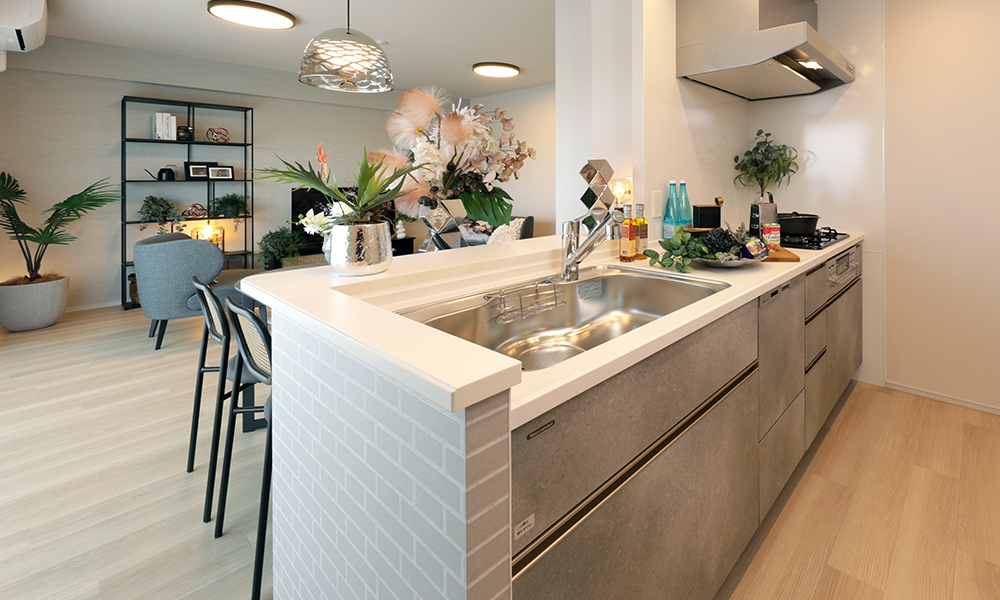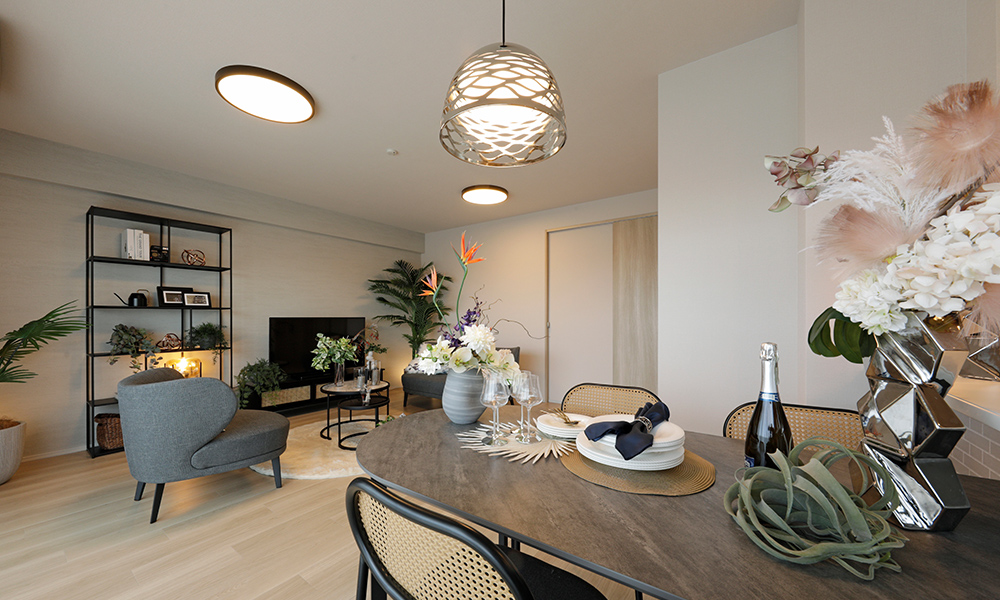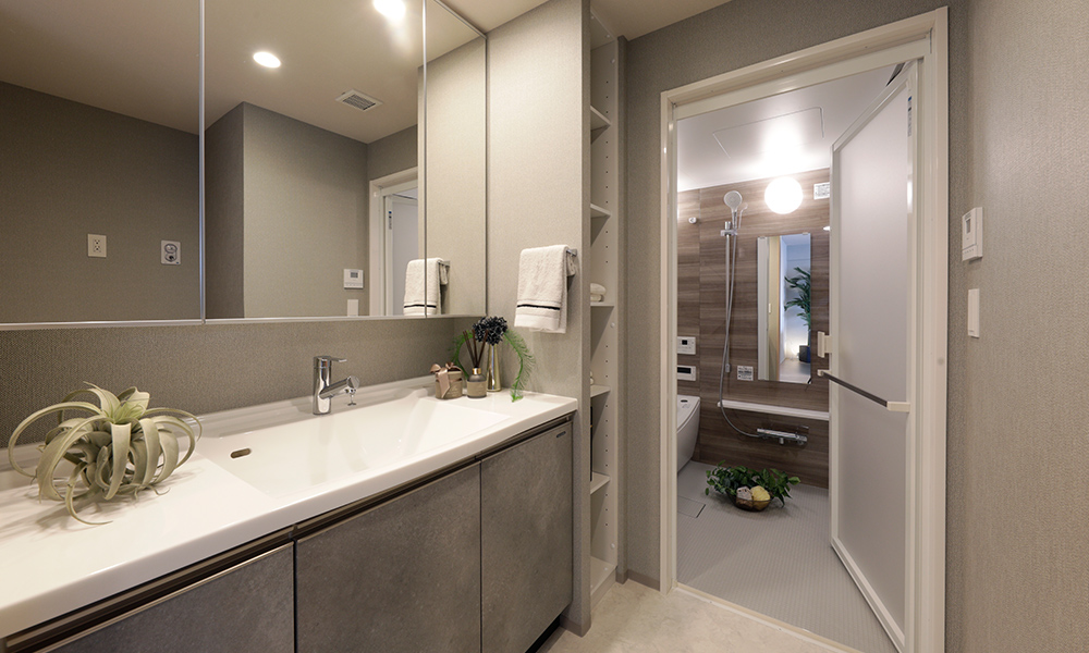 - ※掲載の室内写真は、棟内モデルルーム1402室(2025年10月)、1403室(2025年3月)にて撮影したもので、家具・調度品等は分譲価格に含まれません。一部オプションを含みます。あらかじめご了承ください。
