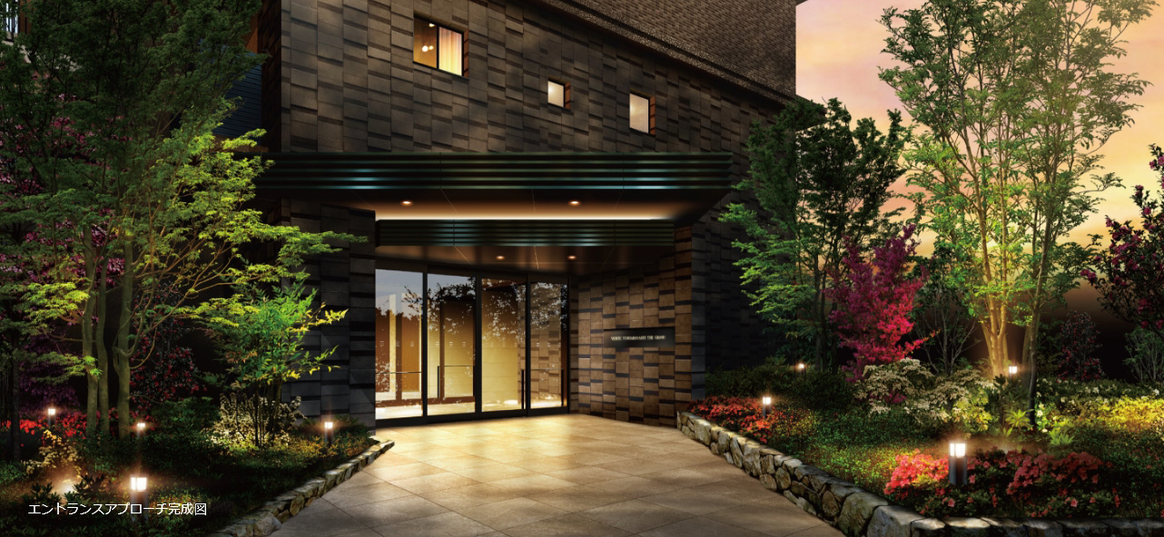エントランスアプローチ。四季を感じさせる植栽や、夜間には穏やかな照明に彩られたエントランスアプローチを通って館内へ。建物入り口の上部には重厚感のある大庇が張り出し、端正な歓待の意匠とともに、背景に聳え立つレジデンスのフォルムさえ借景としながら、ここに住まう方やゲストの方を恭しくお迎えいたします。