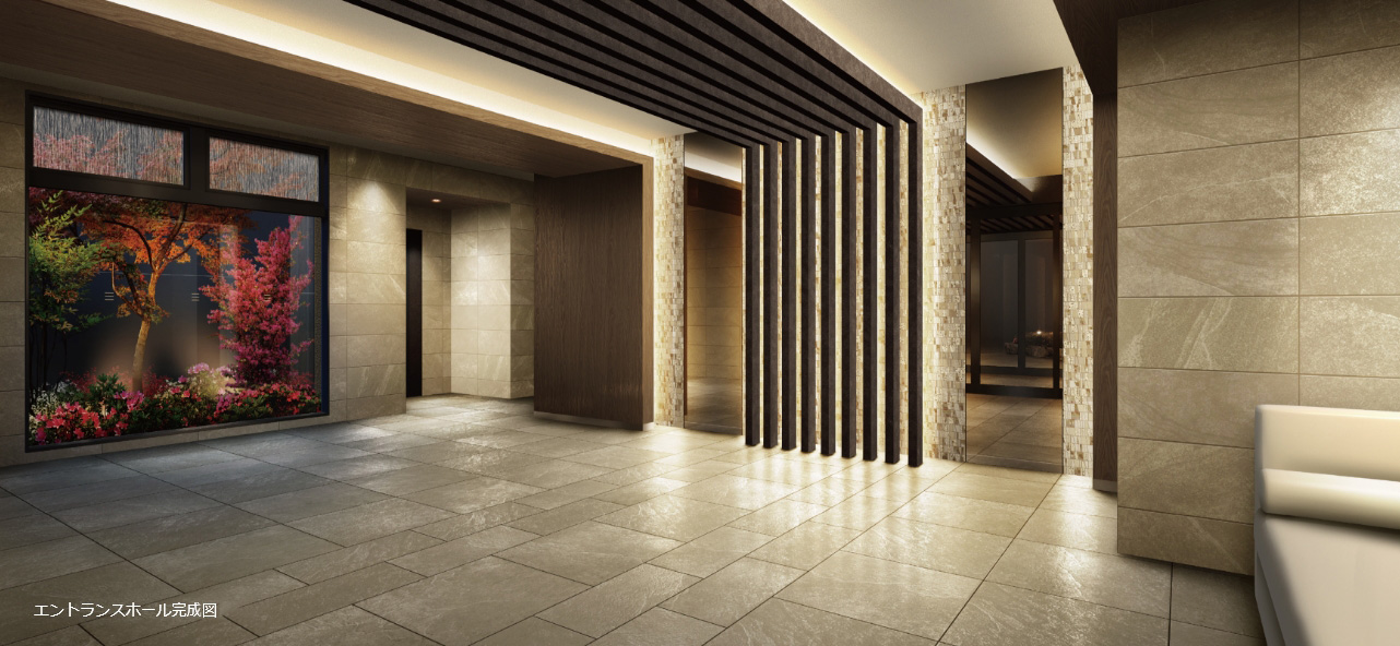 エントランスホールエントランスホールは建物のクオリティを象徴する場所。フロアには石彫の重厚な大判タイルを敷き詰め、一部壁面から天井部へと続く、ルーバーが空間に個性的な表情を演出しています。また、窓外にはモミジなど季節を語り掛ける植栽を配し、それを借景とした心安らぐ空間を創造しています。